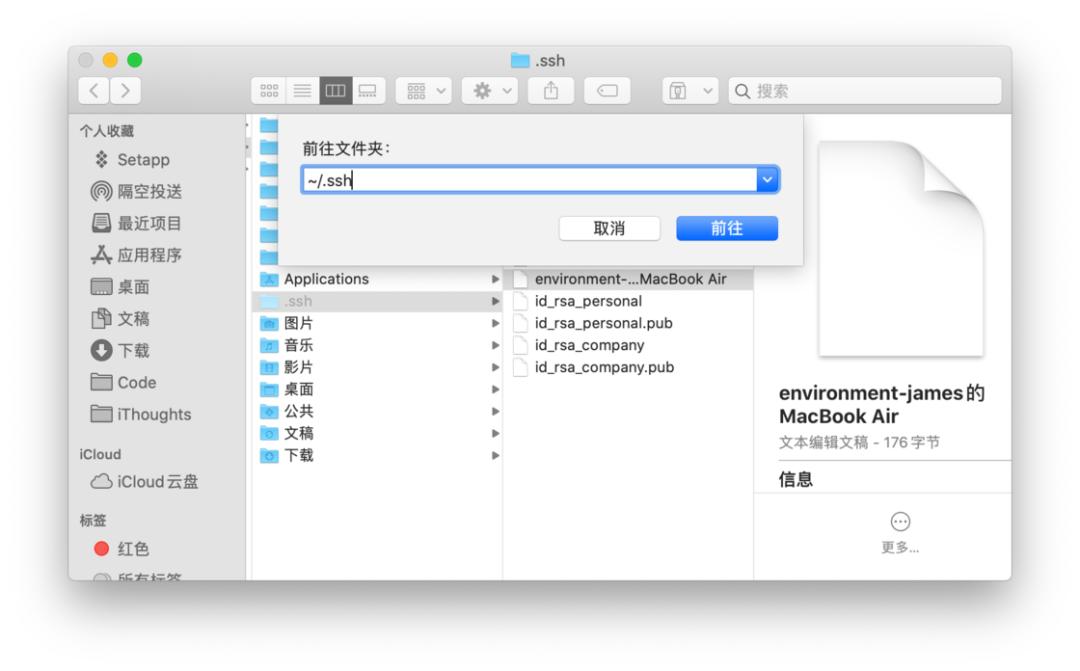 通过 Finder 的快捷键 shift+command+G,前往 ~/.ssh 文件夹。