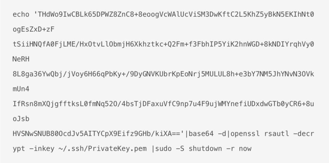 该命令由 4 个小命令组成,由 |(管道符)进行连接。首先使用 echo 输出 base64 编码,通过 base64 -d 解码出二进制流,传递给 openssl 命令解密出明文。最后将明文作为参数,传递给 sudo 命令作为密码使用,执行立即关机的命令。