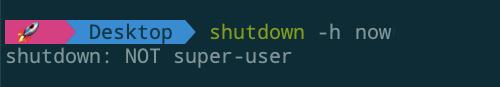 其次,还要注意的是 shutdown 命令属于系统级命令,需要超级用户权限才能执行。如果在终端里直接执行该命令,会有如下的报错,而且也无法关闭电脑。因为目前登录的是用户,而不是超级用户。