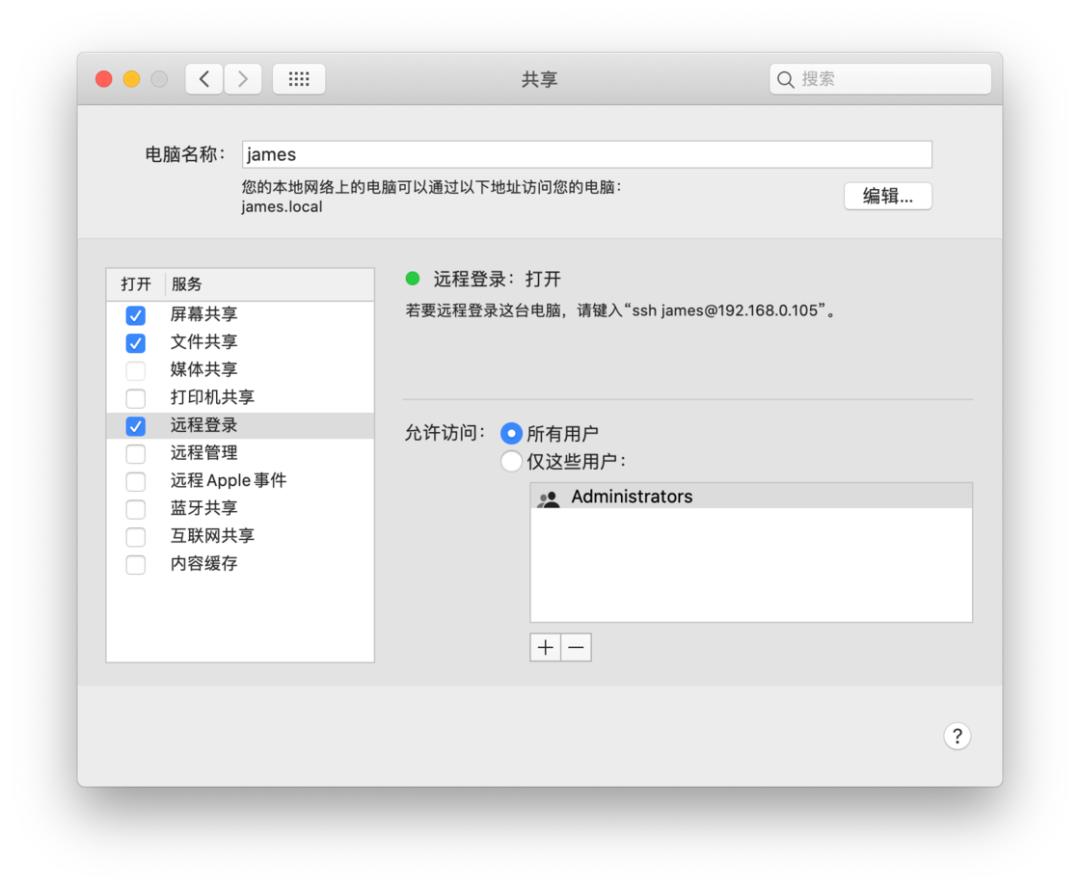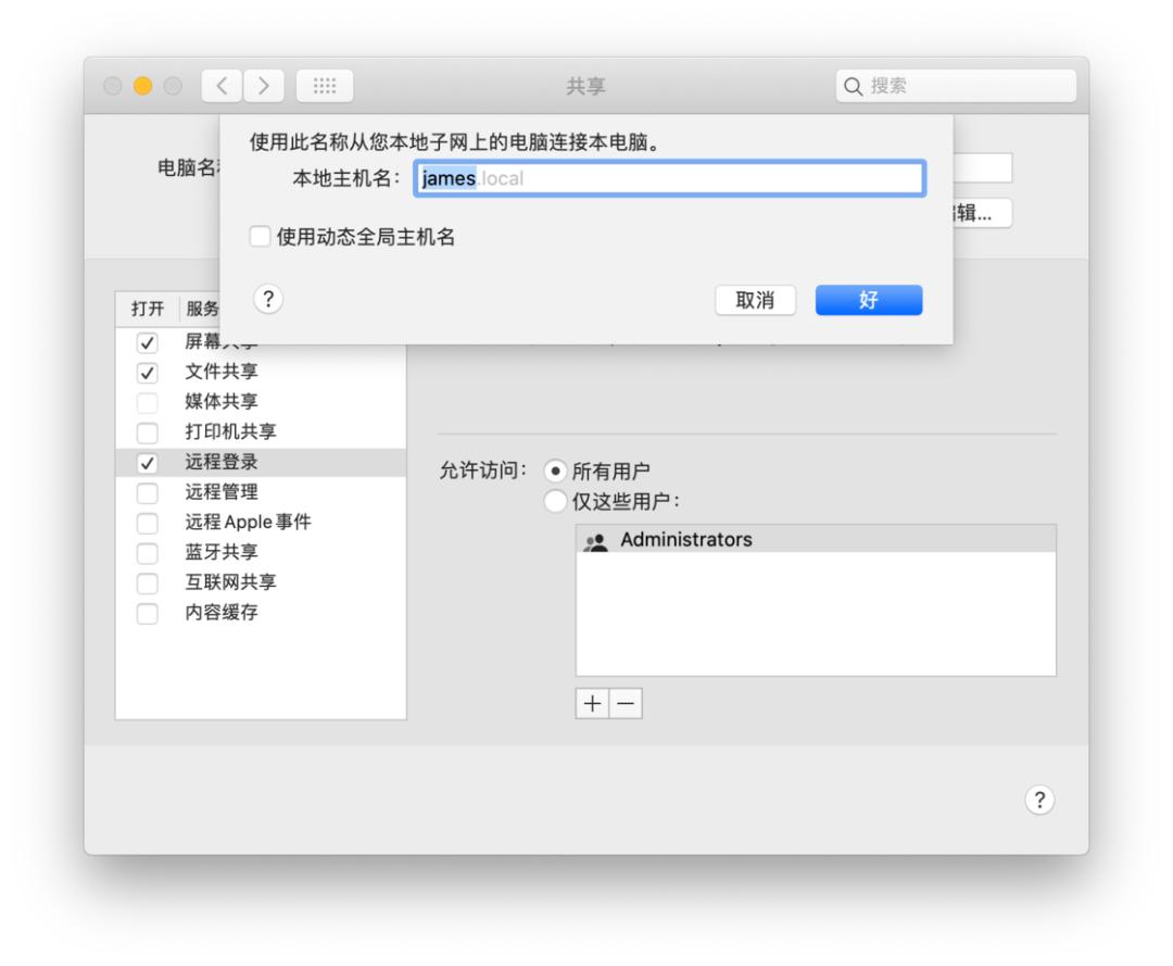 此时,如果要在局域网内访问电脑,只需要访问 james.local 即可。这样做的好处是,即使电脑切换到其他网络下,Mac 在局域网内 IP 地址发生改变,也依旧可以通过主机名访问。