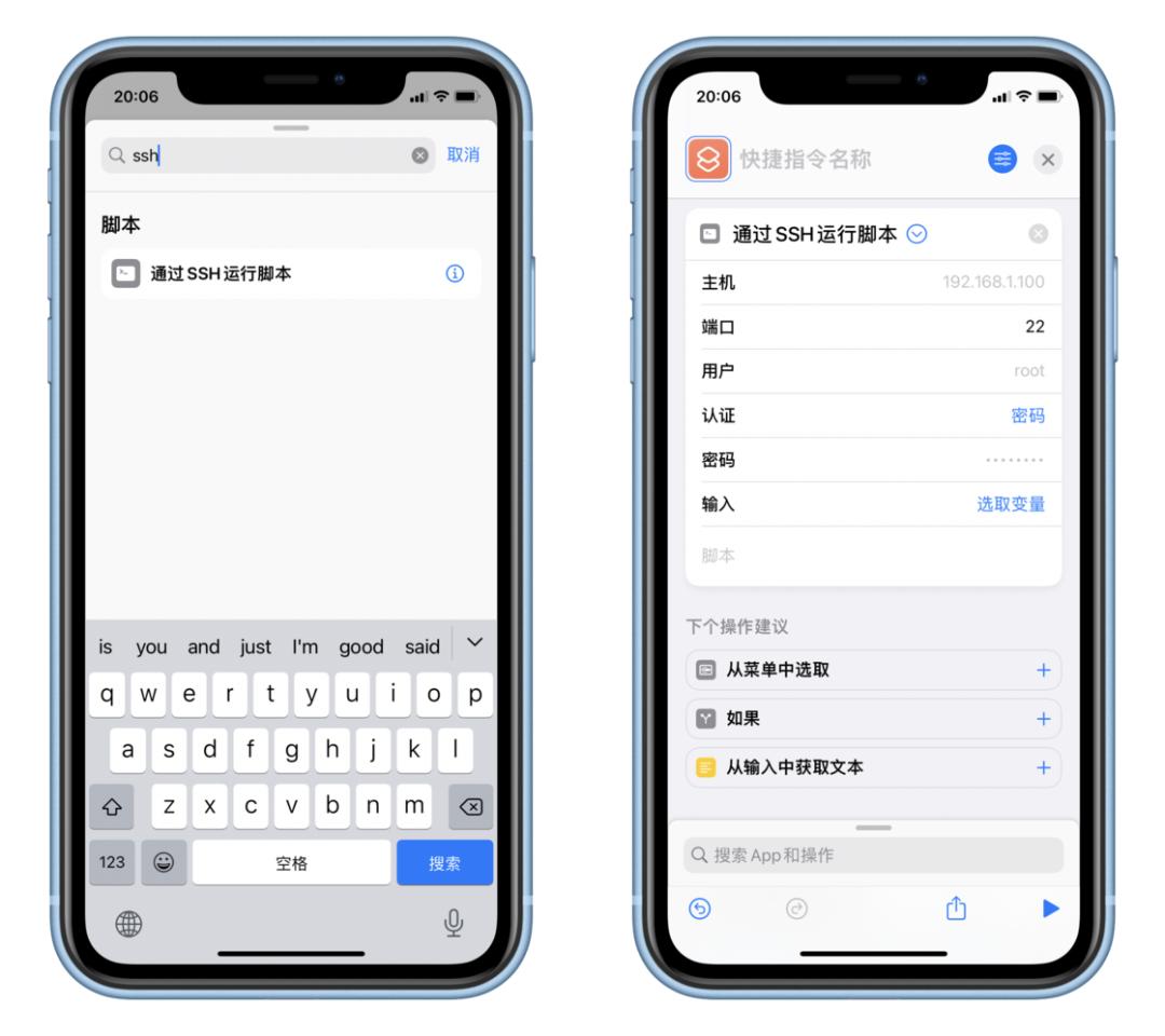 接下来,就要使用构建捷径来实现功能。新建捷径,搜索 ssh 模块,选择「通过 SSH 运行脚本」添加模块,可以看到该模块要求输入以下参数:主机、用户、认证方式、密码和命令。