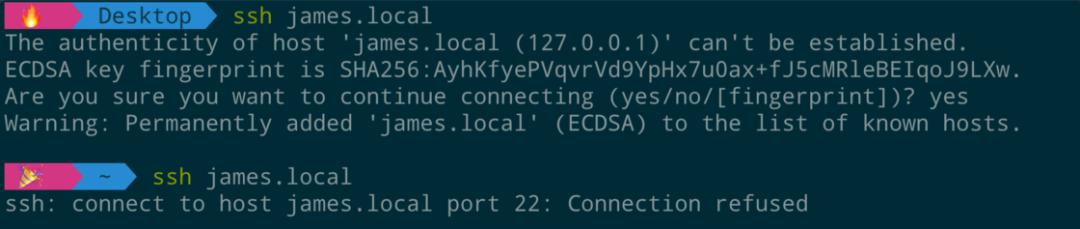 最后,可以通过 ssh 命令确认开启状态。打开终端,输入「ssh 主机名」连接本机,例如图中的「ssh james.local」,如果正常就会询问密钥指纹是否正确。反之,如果 ssh 服务没有正常工作,就会像第二条命令一样显示「Connection refused」。