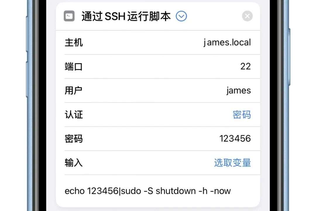 命令构建完成之后,就可以开始填写捷径参数了。如下图所示,可以看出用户名是 james,密码是 123456(当然是假的了)。保存该捷径,命名为关机,通过喊一句「heySiri, 关机」即可关闭电脑电源。当然,这里的关机只是一个演示功能,对于 macOS 用户来说,更常见的电源操作应该是:pmset sleepnow(电脑休眠)。