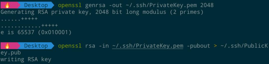 # 生成私钥openssl genrsa -out ~/.ssh/PrivateKey.pem 2048# 生成公钥openssl rsa -in ~/.ssh/PrivateKey.pem -pubout > ~/.ssh/PublicKey.pub