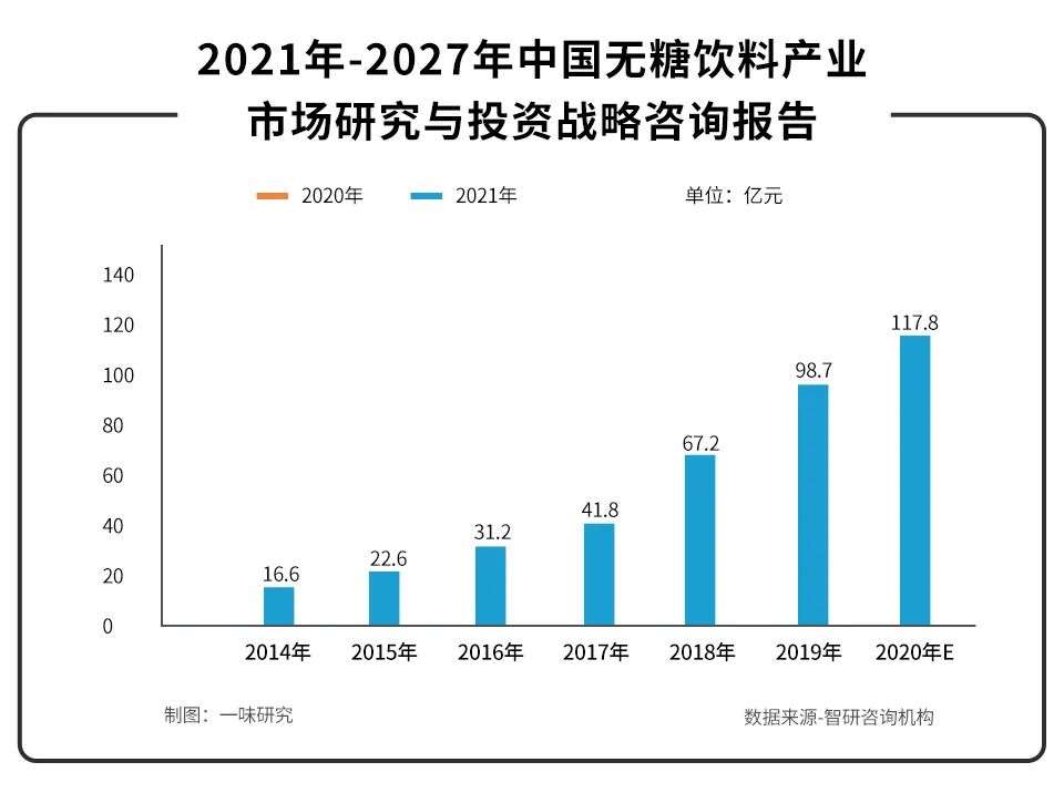根据智研咨询报告显示,无糖饮料市场规模从2014年16.6亿元增长至2020年117.8亿元,年增长率38.69%,远超饮料行业总体增长率。