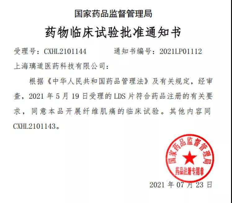 2021年7月28日,由上海璃道医药科技有限公司(以下简称“璃道医药”)开发的化药1类创新药LDS片获得国家药品监督管理局(NMPA)临床试验批准通知书。