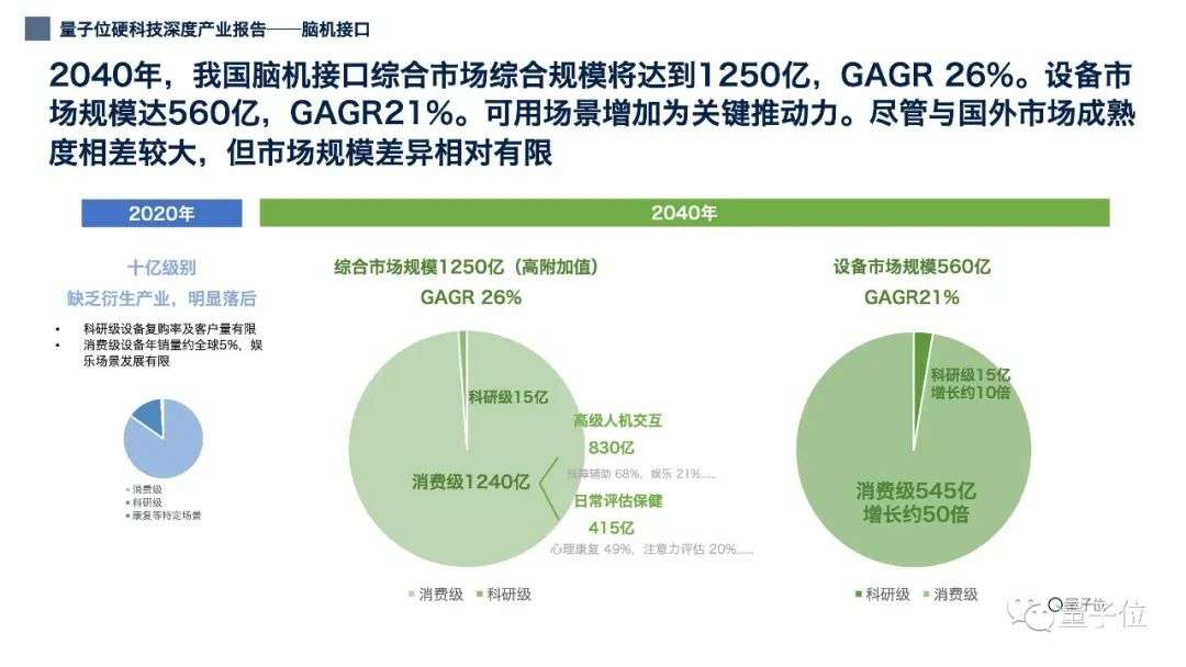 目前我国脑机接口行业的设备市场规模在十亿人民币级别,2040年会达到560亿人民币,综合市场规模更会放大至千亿。