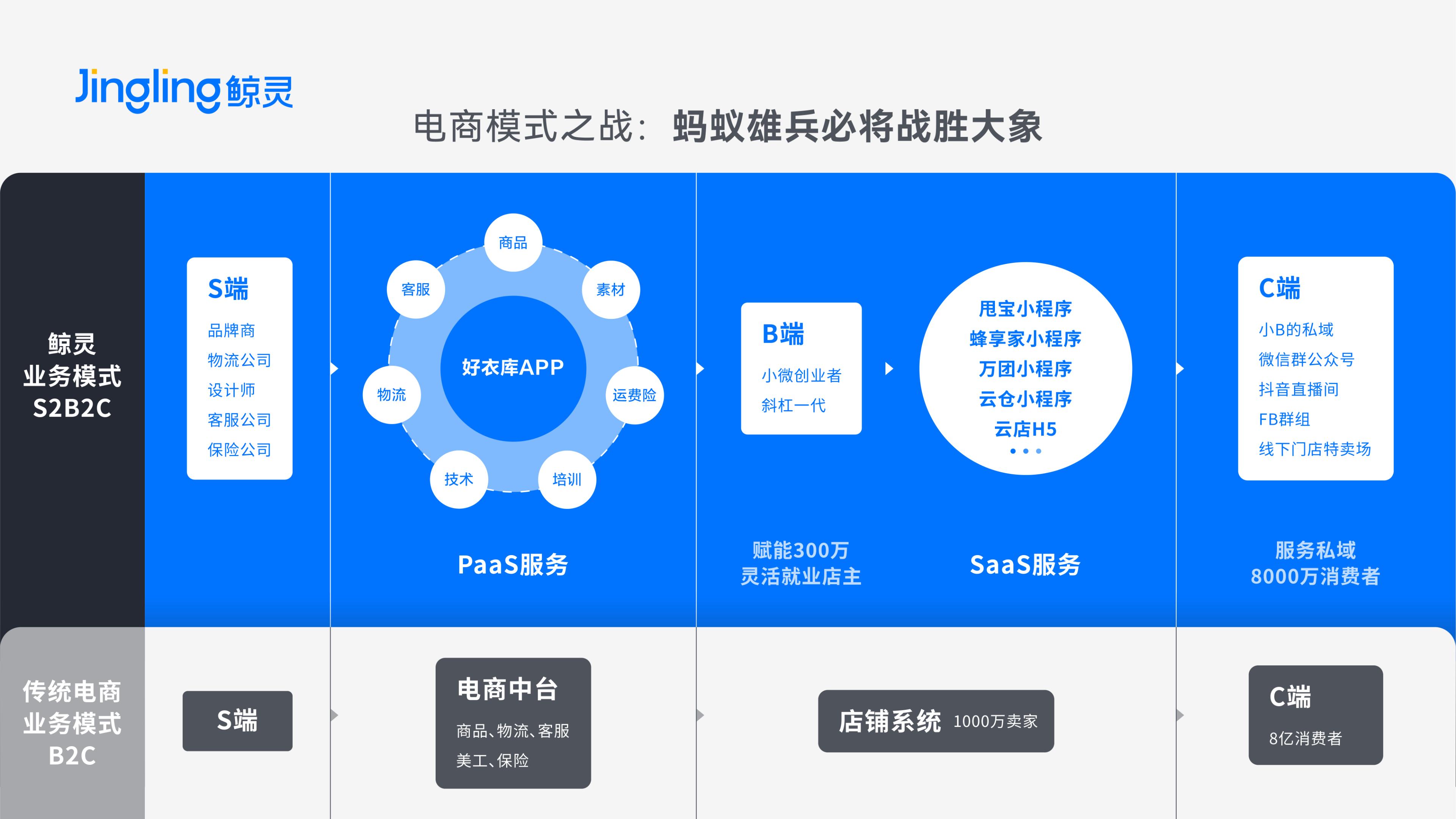 再者,鲸灵创新发展的“PaaS+SaaS”服务模式,可帮助品牌方一站式解决所有烦心问题。从客服、物流、发货到运费险、售后等全程,鲸灵可进行全方位、全流程的赋能。对品牌方来说,只需要专注准备好自己的货就可以了。一方面,品牌方可借力鲸灵“PaaS+SaaS”服务快速扩大规模;另一方面,品牌方可把握最重要的流量终端,不需再受平台方的裹挟。