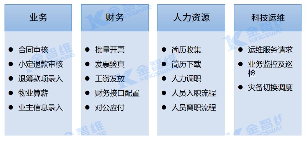 该方案结合RPA+AI技术,根据房地产业务特点进行部署,具有安全性高、易于集中管理、高扩展性等特性。目前金智维机器人流程自动化解决方案可适用于房地产价值链中的业务、财务、人力资源、科技运维等多个领域。