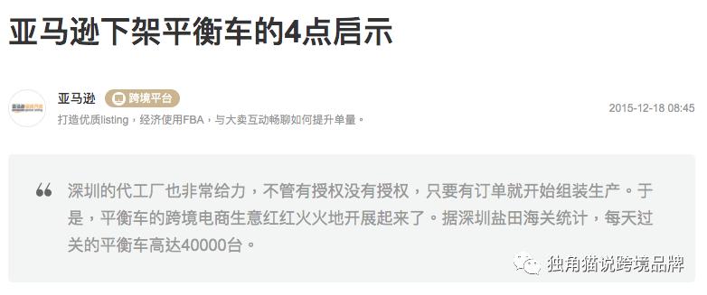 2015年底,出了当时甚嚣尘上的“平衡车事件”。平衡车一度是亚马逊上的大爆品,堪比当年婚纱。有多火呢?光是几个牌子打各种专利的官司就没完没了。圣诞前夕,正是各大卖家发力的时候,洋溢着节日冲量的喜气洋洋,然而这一年,亚马逊却给所有人泼了一大盆冷水:2015年12月,亚马逊强制下架所有销售平衡车的链接,并强制冻结账户资金;亚马逊还发邮件给所有已购买该商品但还未收货的买家,提醒他们可以退货;对于已收到商品的顾客,亚马逊甚至建议丢掉货物,而且可以退款。