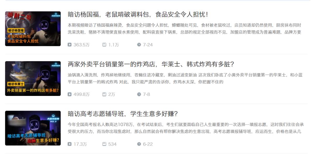 B站揭幕行业的头部UP主“内幕纠察局”,在其创作主页显示投稿20部,目前保留的5部均为卧底题材的创作内容。其中餐饮门店卧底的两部视频,截止到8月10号,播放量均为其他类型卧底食品的几十倍,分别达到363万和499万的播放量。
