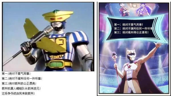 但有意思的是,游戏中“致敬”之处,总能看到些熟悉IP的影子,比如在游戏中对战裁判的台词和90后熟悉的蜻蜓队长台词几乎一模一样,后者是日本1997年播出的特摄剧《铁甲小宝》中的人气角色,时至今日你仍能在中文世界的表情包中看到它的身影。一款游戏处处植入讨好80后、90后群体的经典元素,目标受众可以说是非常明确了。