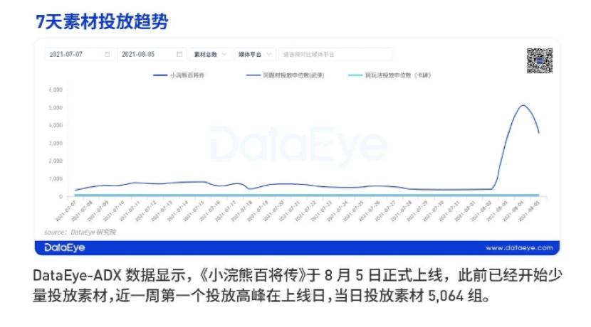 同时根据DataEye-ADX的数据显示,在《百将传》8月5日正式上线后,畅游不仅邀请了德云社的相声演员秦霄贤代言,同时再次加大了素材投放,上线当天投放素材量达到高峰,共投出5064组素材。可以看出无论是IP授权方还是发行方都对《百将传》有着很高的期待。