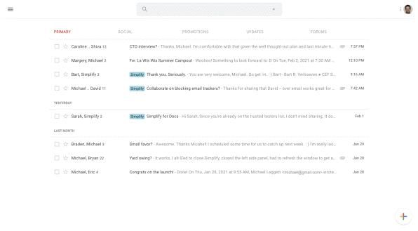 一个干净清爽的邮箱:在过去的17年里,谷歌电子邮件服务系统积累了许多弊端,比如在实际使用过程中Gmail界面非常混乱。相比之下,Simplify Gmail(由前Gmail首席设计师打造的应用程序)在此基础之上做了变革与创新。Web网页浏览器将侧边栏隐藏起来,让界面显得更大、更清爽,使读者更容易阅读电子邮件。此外,Simplify Gmail应用程序还隐藏了谷歌不必要的应用程序按钮,它重新开发设计了按钮和摆放位置,并淡化其颜色,给人感觉十分干净简洁。还有,与其他电子邮件相比,它还可以屏蔽电子邮件跟踪器,将电子邮件按日期分门别类。Simplify Gmail应用程序不仅做到了“物美”,还实现了“价廉”,每年24美元的订阅费(在免费试用后)对于功能一应俱全的电子邮件系统来说根本就是一个小数目。