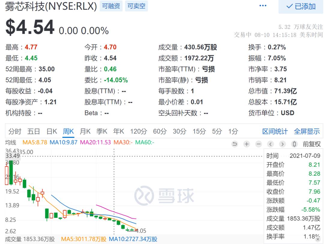其实,以往要是能够上市就算是一种成功,IPO所带来的资本“安全垫”很厚。为了直观展现这一厚度,先看一个例子——雾芯科技(NYSE:RLX)。
