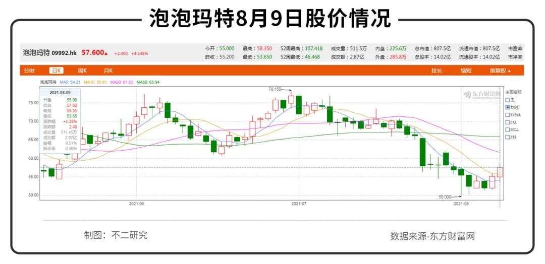 截至8月9日港股收盘,泡泡玛特的股价已经回落到57.60港元,市值则停留在807.52亿港元。