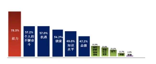 早在2015年,中国青少年研究中心针对3600多名企业青年开展了一项调查。结果显示,在决定个人成功的因素上,青年们普遍认为最主要是靠能力(78.3%)、个人的不懈奋斗(57.2%)、机遇(57.0%)和健康(54.2%)。而亲友和家庭的社会背景(25.0%)、运气(21.2%)、外貌(11.7%)、其他(2.2%)则被排最重要因素的最后4位。