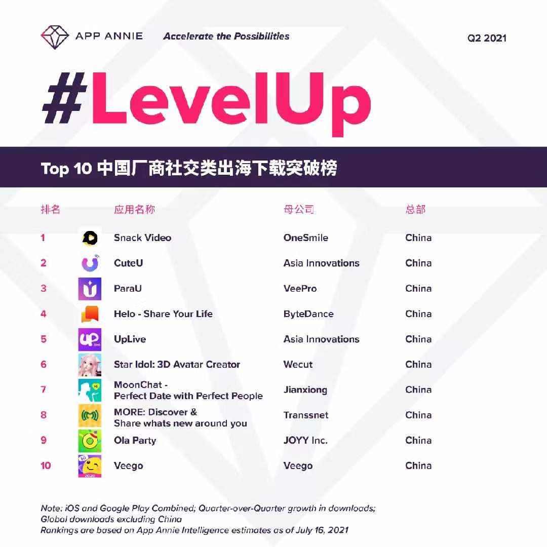而随着国内陌生人社交、游戏社交、同性社交,还有近些年大火的视频社交和音频社交等赛道中的竞争日趋白热化,越来越多的玩家将商业触角伸向了海外市场,以寻求新的增长点。这其中,除了我们熟知的 TikTok、Kwai、BIGO Live、TanTan、Yalla、Blued 外,还有此次拿到第5名的 Uplive。据悉,Uplive 的母公司亚创是一家成立于2013年的社交娱乐集团。公司主要为来自东南亚、中东北非,以及拉美等150多个新兴市场国家和地区的4.1亿用户提供社交类产品。