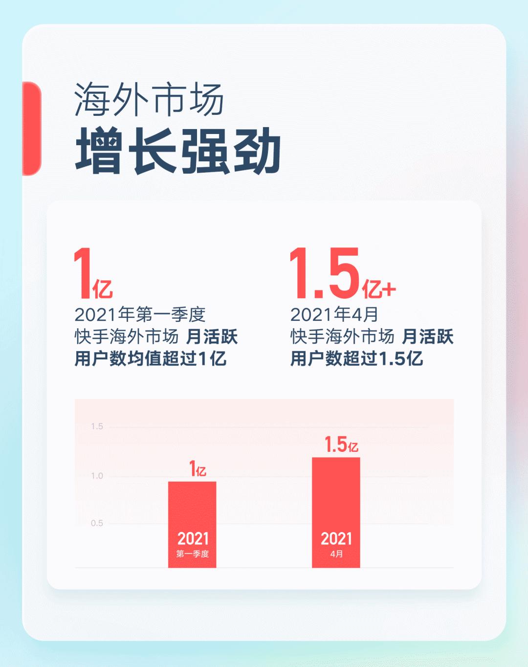 在2021年第一季度财报中,快手这样描述在海外的成绩——“我们在海外市场亦取得了令人鼓舞的成果,平均月活跃用户数超过1亿,到2021年4月继续增长至超过1.5亿”。6月23日,在快手成为2020年东京奥运会及2022年北京冬奥会转播商时,宿华透露“快手全球月活用户数达到10亿”,但被质疑水分较大。