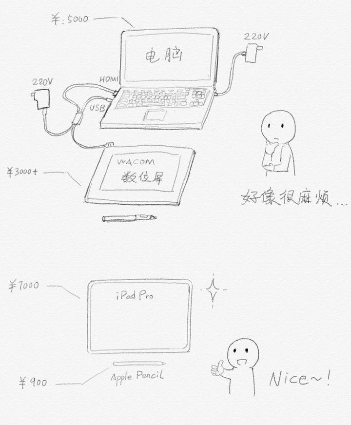 美术工作者“乌贼ichabod”举例,用电脑画画要配备合计至少8000元的电脑和数位屏,但是用iPad Pro+触控笔,7900元就能解决。并且在平板上不需要时刻接通电源,也没有复杂的连接线,方便用户随时创作[11]。