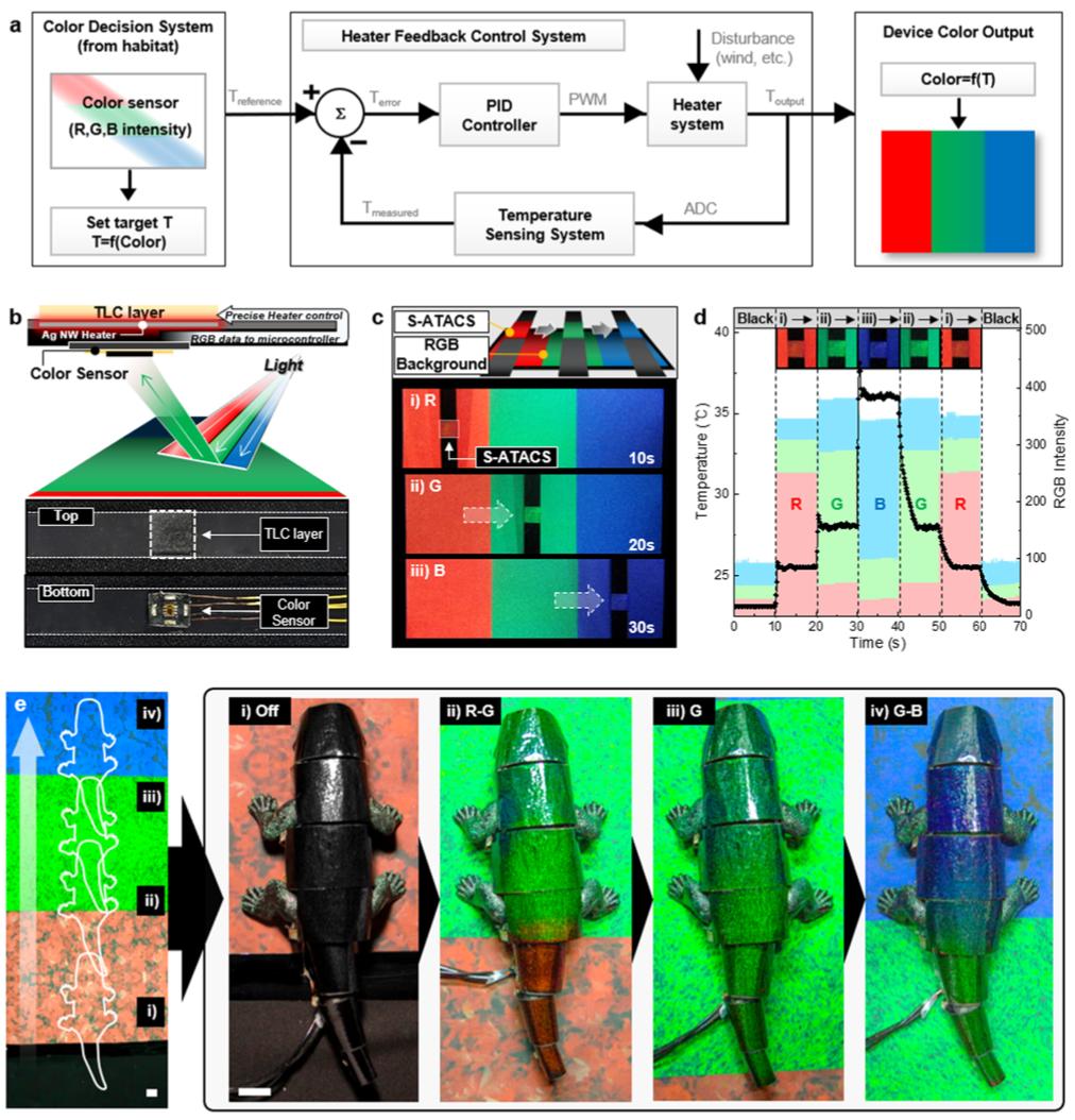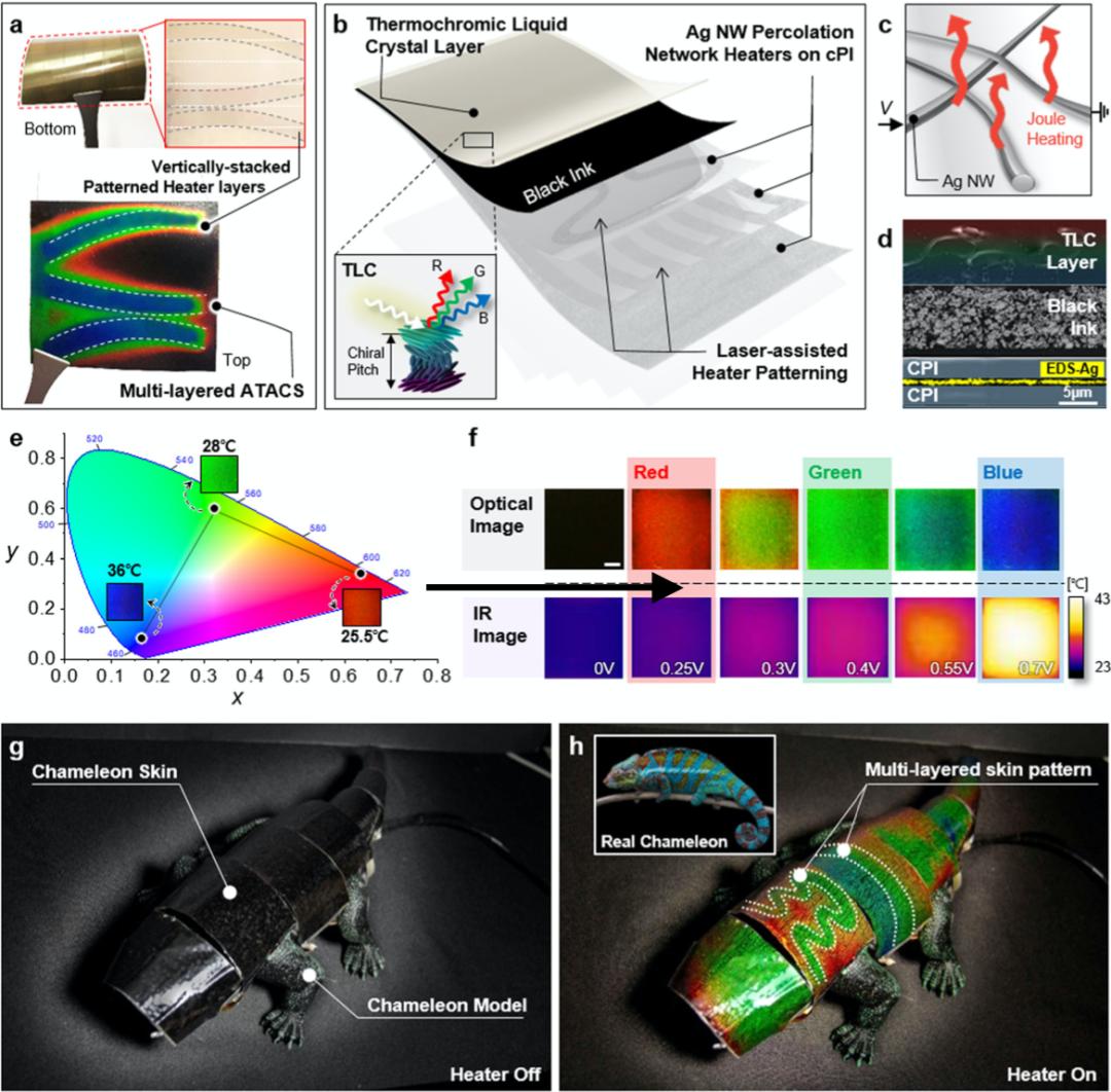 在这项研究中, 研究人员使用了一种全新策略,他们将热致变色液晶层与纵向堆叠、有图案的银纳米线网络进行集成(该技术缩写为:ATACS),再结合颜色传感器和反馈控制系统,最终制造出了 “人造变色龙皮肤”,并应用于一个软体机器人上进行演示。