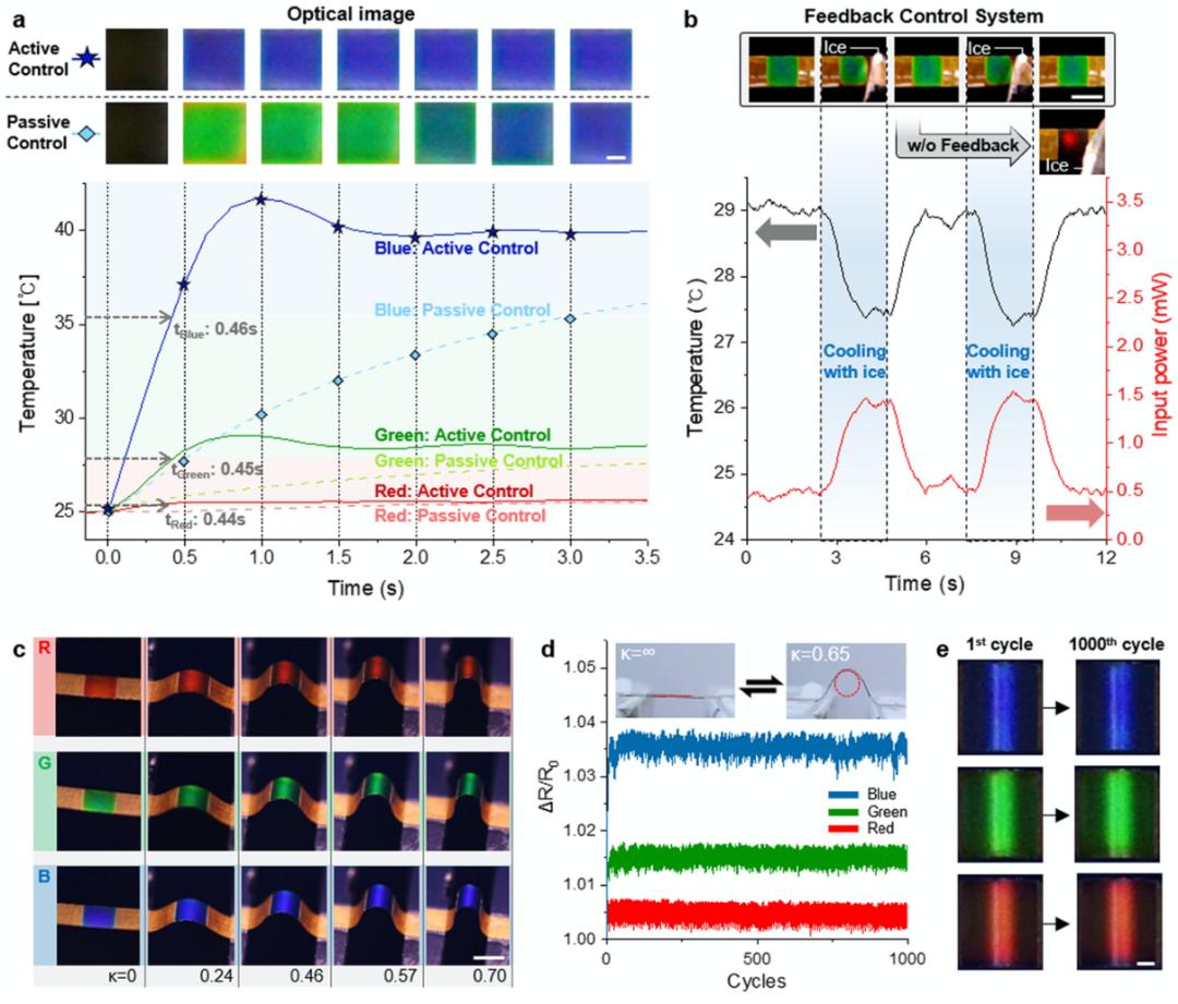 同时,研究人员注意到,Ag-NW 网络的电阻温度系数(TCR)足够大、线性和非滞后,可将 Ag-NW 网络的电阻用作负反馈控制系统的过程变量,以在外部环境波动下保持目标温度,热通量的主动控制可进一步缩短响应时间,甚至能与动物的生理颜色变化相媲美。