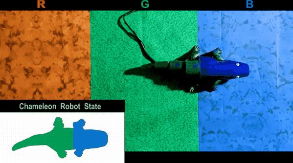 作为策略的最终演示,研究人员开发了一个自主自适应的移动变色龙机器人,随着变色龙模型的移动,人工伪装被激活,跨越 3 个不同的栖息地,身体快速切换显示了 RGB 颜色。