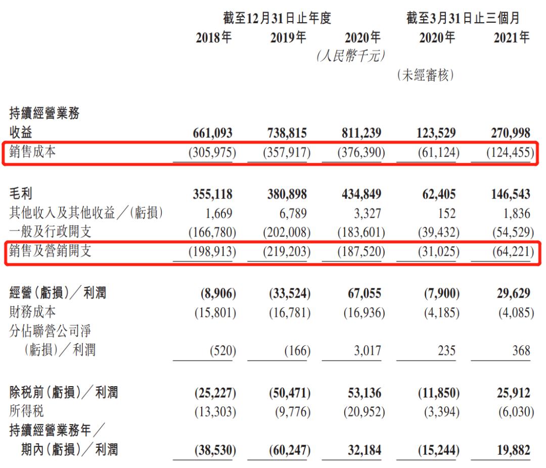 招股书所指的销售成本主要包括采购成本、员工成本以及折旧摊销等,这部分成本对于企业正常经营而言是必要存在的。因此,重点应该关注“销售及营销开支”。