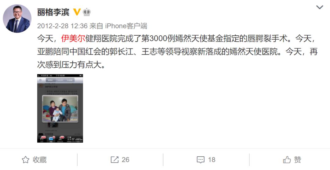 2012年,李斌退出伊美尔之前,还在微博上发布了伊美尔完成了3000例嫣然天使基金指定的唇腭裂手术的消息。此外,博文中提及的“嫣然天使医院”,正是由汪永安、李斌、唐越与李亚鹏并列作为创始董事和法人。
