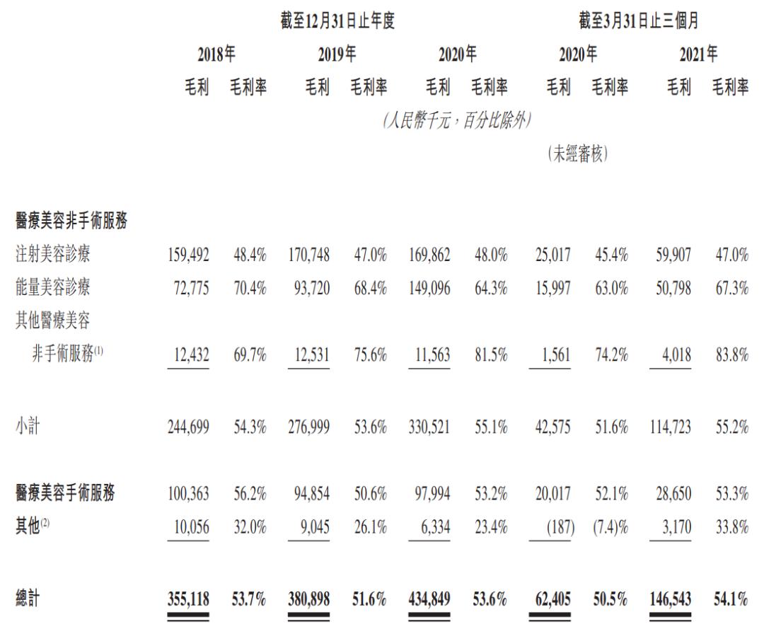 从客单价来看,手术类服务远高于非手术类:截至2021年3月31日,手术服务的每次平均费用为7364元,而注射美容诊疗和能量美容诊疗的每次平均费用分别为2007元、1841元。