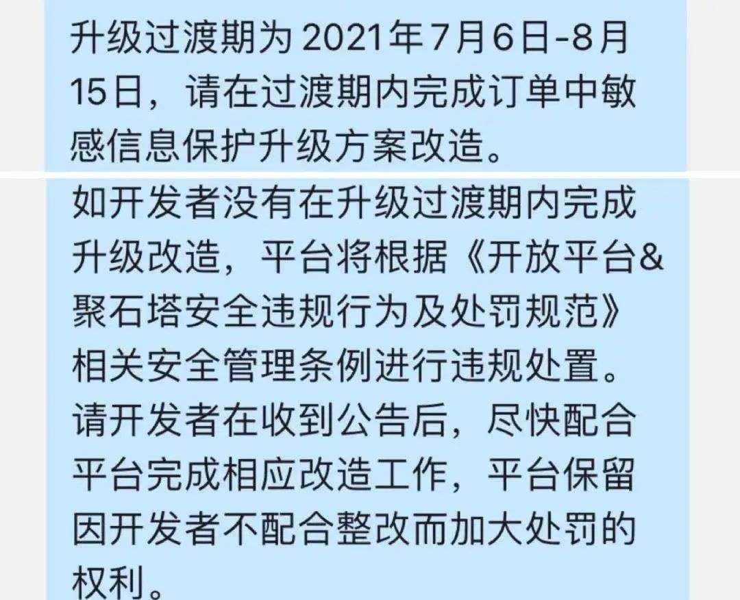 据悉,有业界传闻称,从2021年8月1号起,为防止客户信息泄露被诈骗分子利用,所有电商、新零售平台(天猫、京东、淘宝、头条抖音、快手、拼多多等)均会加密客户信息。