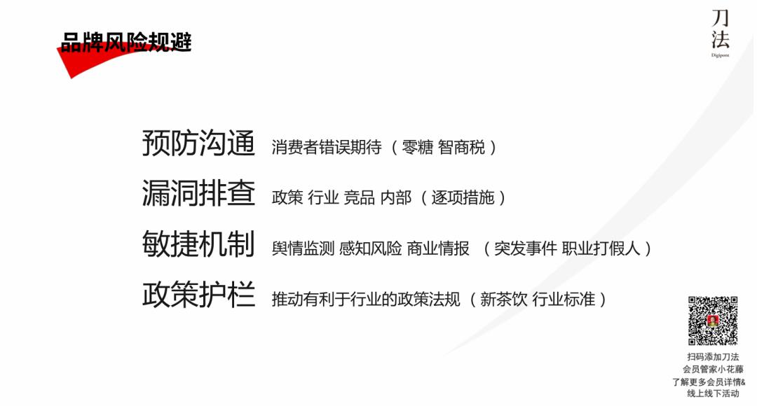 (4)政策护栏,指去帮助本行业去推动有利于行业的一些政策。比如喜茶经常被投诉说茶里面吃出虫子,或者有超标、不合格的问题。这种情况下,企业可以在风险防范时,帮助行业推动一些政策或标准。