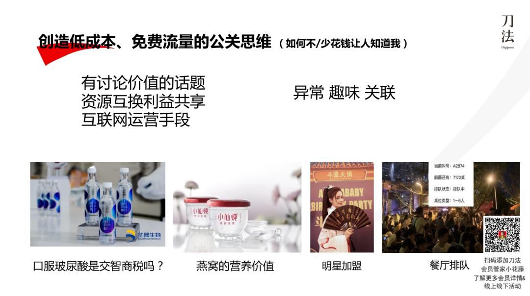 包括我去成都,那里餐饮品牌和本地的快消品牌明确说不要讲公关,好像这是大企业才干的事情。我在跟 300 个从事会展的行业伙伴交流时,他们也认为不要提公关,更多是讲流量、讲增长。