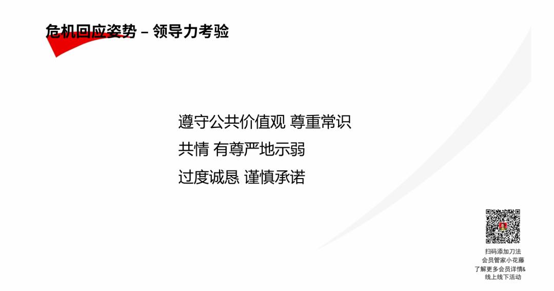 在处理危机时,可参考舆论世界的示弱规律,即现实世界的强者是舆论世界的弱者。因此企业要有尊严地示弱,要坚持共情和倡导,而不是简单认怂。