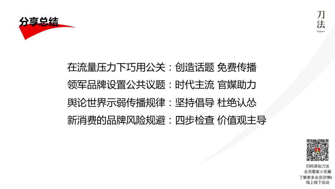 总结下来,公关的核心是能够创造免费传播,关键词是“免费传播”,通过利用好创意资源和广告大咖的资源去主动抛出话题,然后创造免费传播。