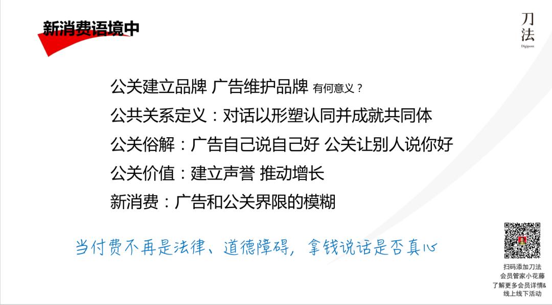 而现在很多快速增长的品牌,公关部都避免不了要付费投放。但在投放的时候,怎样算公关,付费跟免费有什么区别?当付费不再是法律道德障碍时候,该怎么看花钱请自媒体大号、小红书种草,包括让公众号大 V 帮忙发文章等这类行为,这种是公关还是广告?
