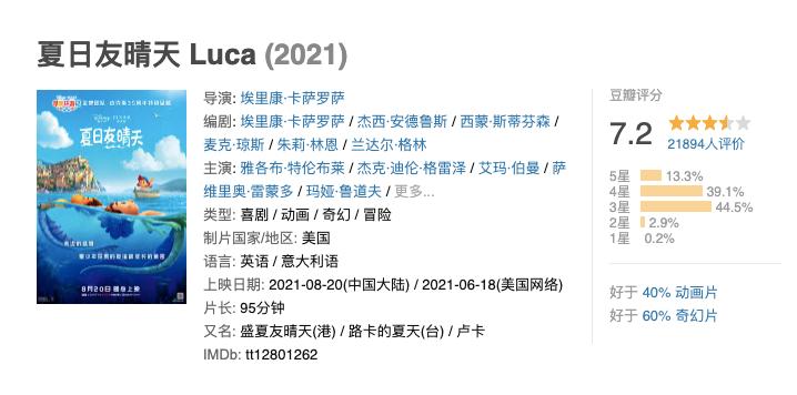 只是这部动画电影能否让电影市场买账,还是一个问题。《夏日友晴天》已经于6月18日在Disney+上上映,同时这部电影在Disney+上观看并不需要额外付费。这一度让皮克斯员工不满,有外媒报道,皮克斯有员工直言不讳,“别说电影院了,我们连付费点播都不配吗?”而电影在海外流媒体上映之后,国内迅速出现了盗版资源,豆瓣上也迅速开分,目前该电影豆瓣评分7.2分。时隔两个月,这部电影是否还有新鲜度也有待观察。