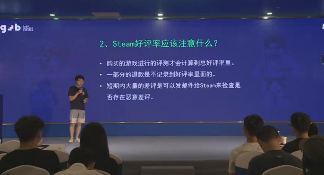 你买了又退款了是不算在好评率里的,玩了两个小时之后的才算进去。之前我跟一个开发者朋友聊天,我说这个玩家给你游戏打了差评,但他玩了500个小时。他的差评内容大家知道是什么吗,说这个游戏不耐玩。我说,是我们这个游戏不耐玩,他才玩到500个小时,没让他玩5000个小时,所以给了个差评,我们活该。