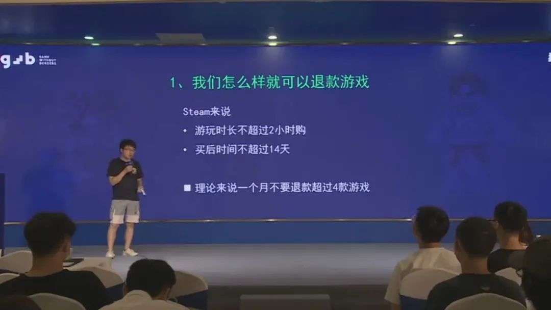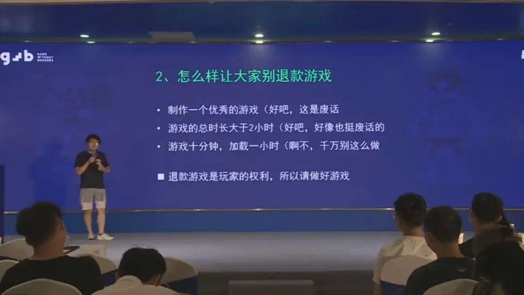 第三点大家别学,我以前玩一个游戏,那个服务器光加载就加载了十分钟,等我进去之后又读盘读了十分钟,然后进去之后网络又比较卡,我又掉出去了,重新登录又花了20分钟,玩了10分钟之后又掉出去了,于是这两小时就过去了,我还没玩上。大家不要故意这么干。作为一个玩家我有权利退款,因为平台有这样的设定。大家也不要去厌恶这些退款的玩家,这是他们的权利,因为他们觉得不好玩,他们觉得有一些问题。作为发行者来说,我们要思考他们为什么退款,而不是说我刻意让他们不要去退款,每一个玩家退款一个游戏一定是有原因的。根本情况下我们还是要把游戏做好。