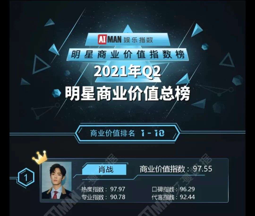 那么代言效果如何?可以通过一个数据来找到线索:根据AIMAN娱乐指数显示,通过热度指数、口碑指数、专业指数、代言指数四个板块的综合评价,第二季度肖战以97.55指数排在明星商业价值榜首。