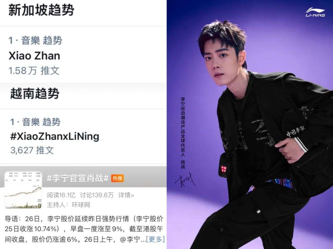 3月26日,在支持新疆棉花后,李宁借势官宣了肖战成为运动潮流产品全球代言人,官宣即巅峰,微博热搜直接爆了。不仅肖战在国内掀起一波热潮,他还带着李宁走出了国门,相关话题直接登到越南、新加坡等多国趋势热榜。