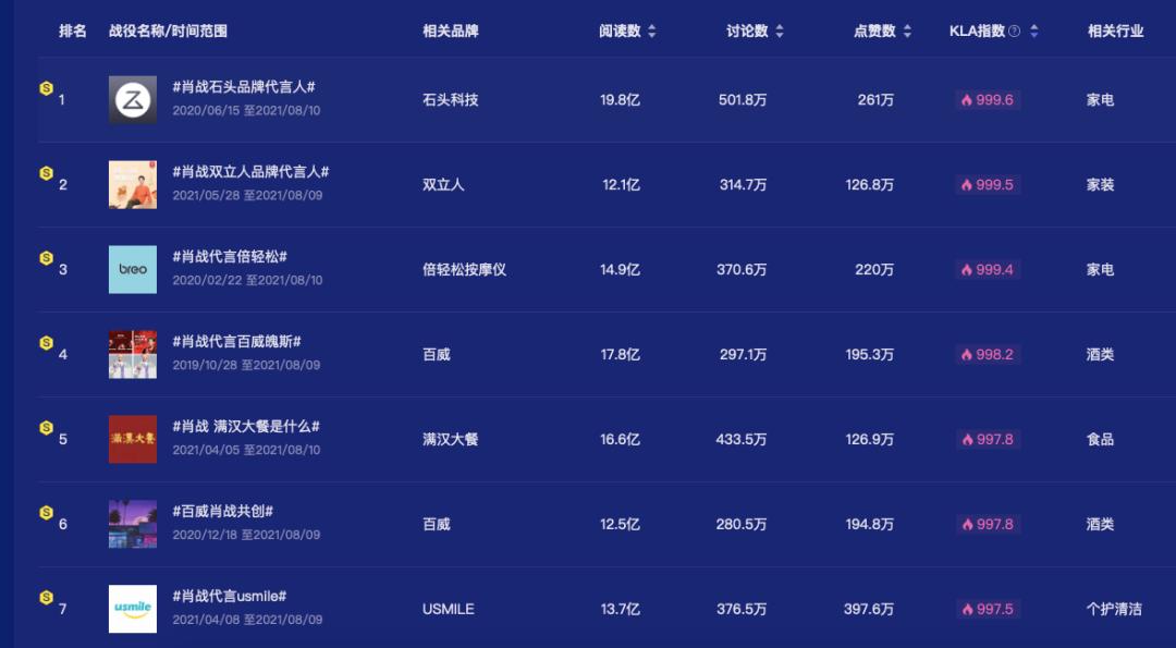 根据战役排行呈现的KLA指数显示,肖战在与品牌合作过程中,也展现出了比较高的品牌合作表现力,这也是他获得更多品牌选择的重要原因。
