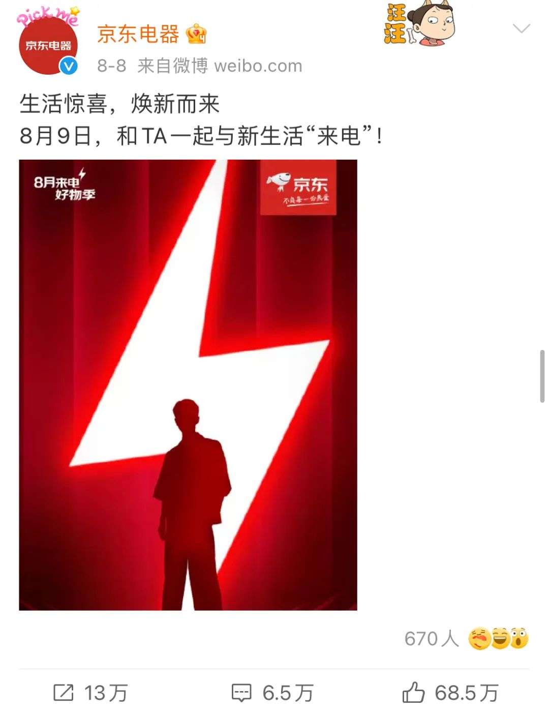 8月8日上午10点05分(肖战生日为10月5日),京东电器的官微发布了代言人预热动态,一个小时内点赞破25万。官方虽然未提及代言人姓名,只放了一张剪影图,但是足够让粉丝辨别自家偶像。