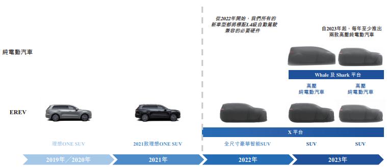 但值得注意的是,理想汽车三年只卖了理想ONE这一款车型,车型显然太过单一。按照招股书规划,理想汽车将在2022年推出一款全尺寸豪华智能增程式电动SUV,并于2023年推出另外两款SUV车型。另外,理想汽车也在开发用于其未来的高压纯电动汽车的平台Whale和Shark,并计划于2023年起,每年至少推出两款高压纯电动车型。