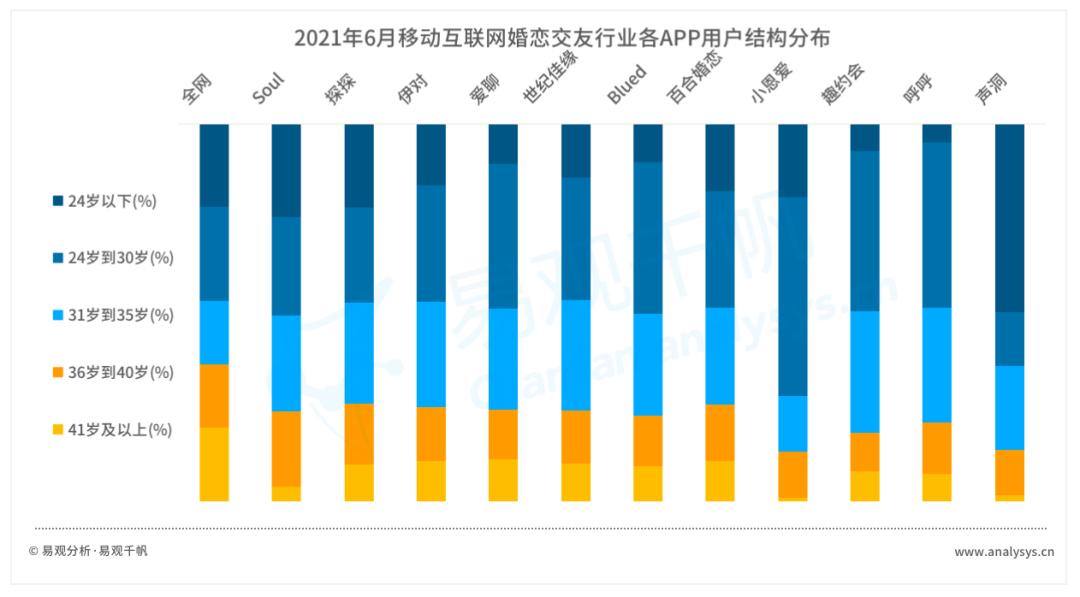 从各细分行业头部APP用户年龄分布来看,婚恋交友应用的普遍年龄在24到35岁之间,灵魂社交、声音社交这类创新社交模式对24岁以下的年轻用户吸引力较大。