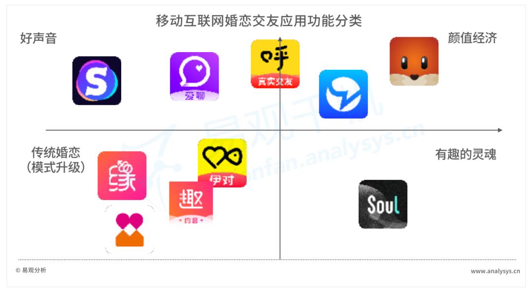 从细分行业头部APP用户规模和功能分类来看,由于核心用户是年轻群体,“灵魂匹配”(通过大数据算法寻找志同道合的朋友)和颜值社交(探探)的用户受众最为广泛,而传统婚恋交友软件也纷纷通过玩法创新,来寻求用户突破。以伊对为例,其通过实时视频互动解决了陌生人线上社交破冰及真实性的难题,并以社交网络为载体,多场景为用户创造更多恋爱机会,成功斩获近千万的用户。