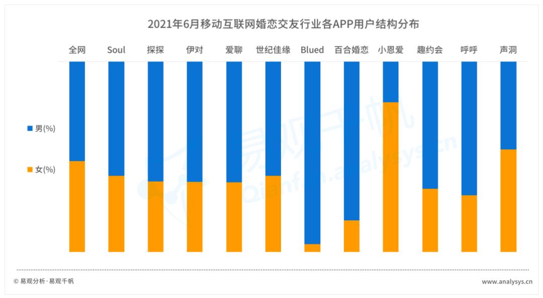 从各细分行业头部APP用户性别分布来看,除小恩爱这类情侣互动应用,以及声洞这款主打声音社交应用,婚恋交友男多女少成为行业普遍现象。