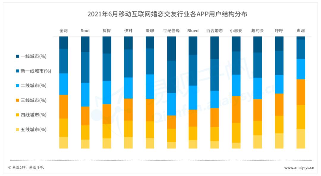 从细分行业头部APP用户各级城市分布来看,世纪佳缘、百合婚恋这类传统婚恋交友平台,核心用户群体以二线以上城市为主。而下沉市场中,生活节奏相对较慢,更在乎交友模式的趣味性,呼呼、声洞这类趣味交友模式反而能斩获更多的下沉流量。