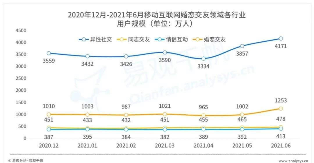 在疫情反复的大背景下,单身群体表现出强烈的线上社交诉求,婚恋交友领域一扫前期的阴霾,6月异性社交、婚恋交友行业的用户规模增长显著,分别达到4171万人和1253万人,创出近半年的高点。