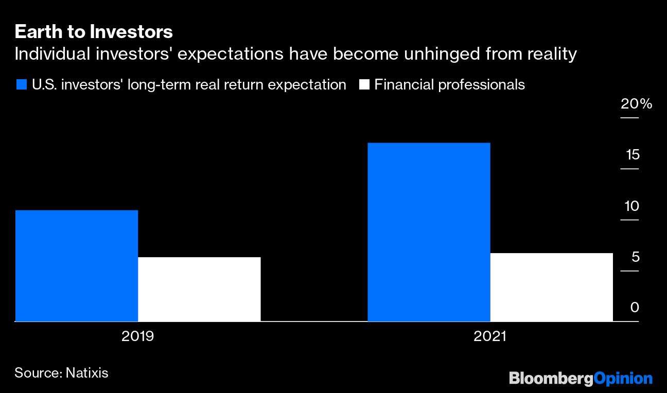 大家对于多元化投资组合能实现什么也开始变得不着边际。在对个人投资者的最新调查当中,法国银行 Natixis SA 报告称,美国投资者预计自己的投资组合在扣除通胀后每年能带来 17.5% 的长期回报,这比他们在Natixis 2019 年的调查当中所预期的已经不切实际的 10.9%又大幅跃升了。除了早期风险投资以外,我不知道有哪种资产类别能够产生如此高的长期回报。
